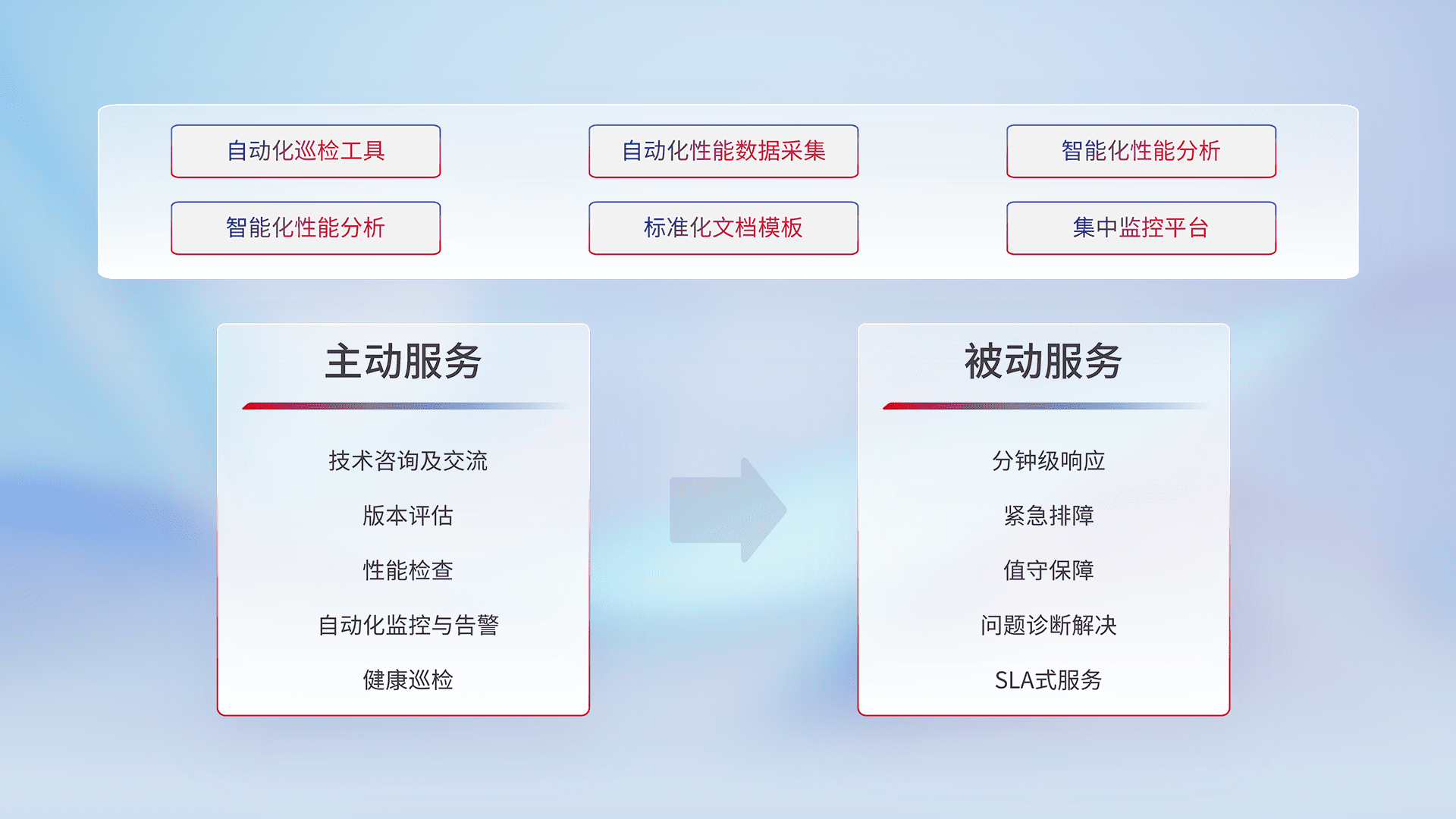 智能化工具和标准化文档,,,保障服务质量,,,,提供主动服务(包含技术咨询、、版本评估、、、、性能检查、、、、自动化监控与告警、、、、健康巡检)和被动服务包含(分钟级响应、、、、紧急排障、、、值守保障、、、问题诊断解决、、、、SLA服务)。。。